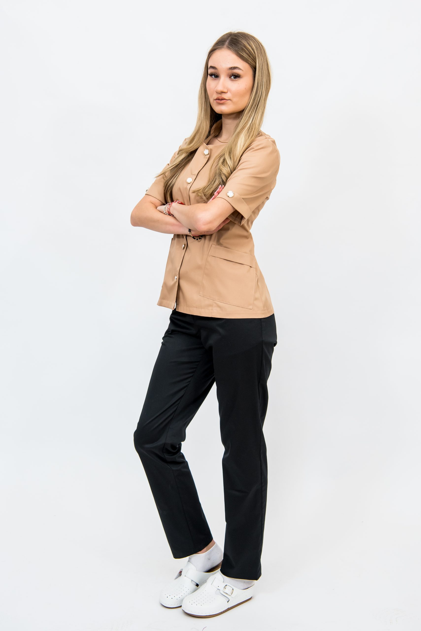 - Culoare Bej: Nuanța oferă un look curat și profesional, ușor de asortat cu alte piese ale uniformei medicale.